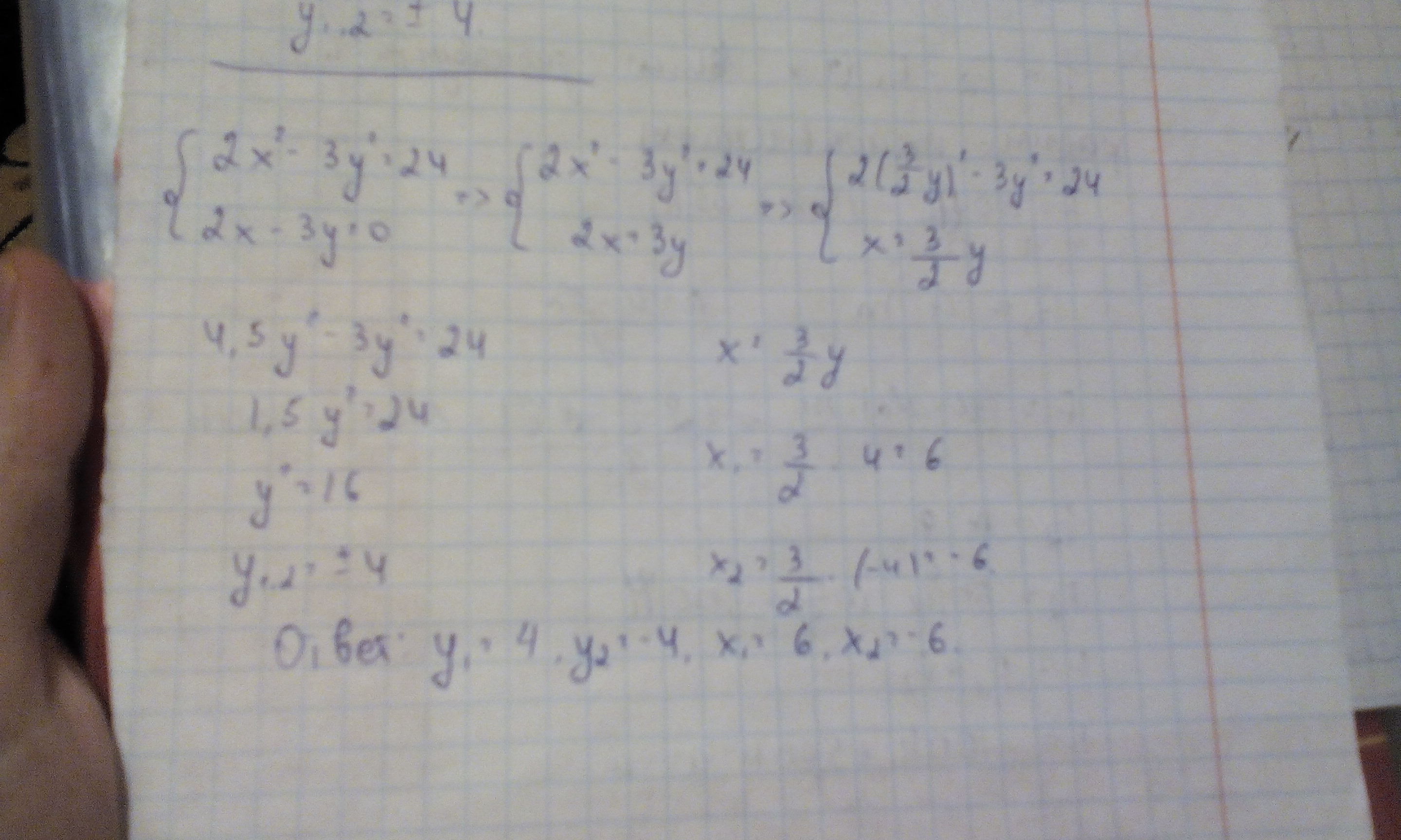 способом подстановки. где без квадрата находишь какое либо число, например: 2х=3у (это первая система у тебя) потом его подставляешь во второй пример