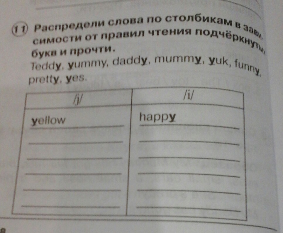 Распредели слова по столбикам в зависимости от правил чтения подчеркнутых букв и прочти Teddy, yummy, daddy,mummy, yuk,funny,pretty,yes.