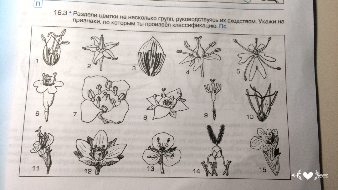 Раздели цветки на несколько групп, руководствуясь их сходством. Укажи на признаки, по которым ты произвёл классификацию.