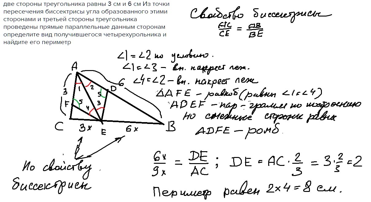 две стороны треугольника равны 3 см и 6 см Из точки пересечения биссектрисы угла образованного этими сторонами и третьей стороны треугольника проведены прямые параллельные данным сторонам определите вид получившегося четырехурольника и найдите его периметр