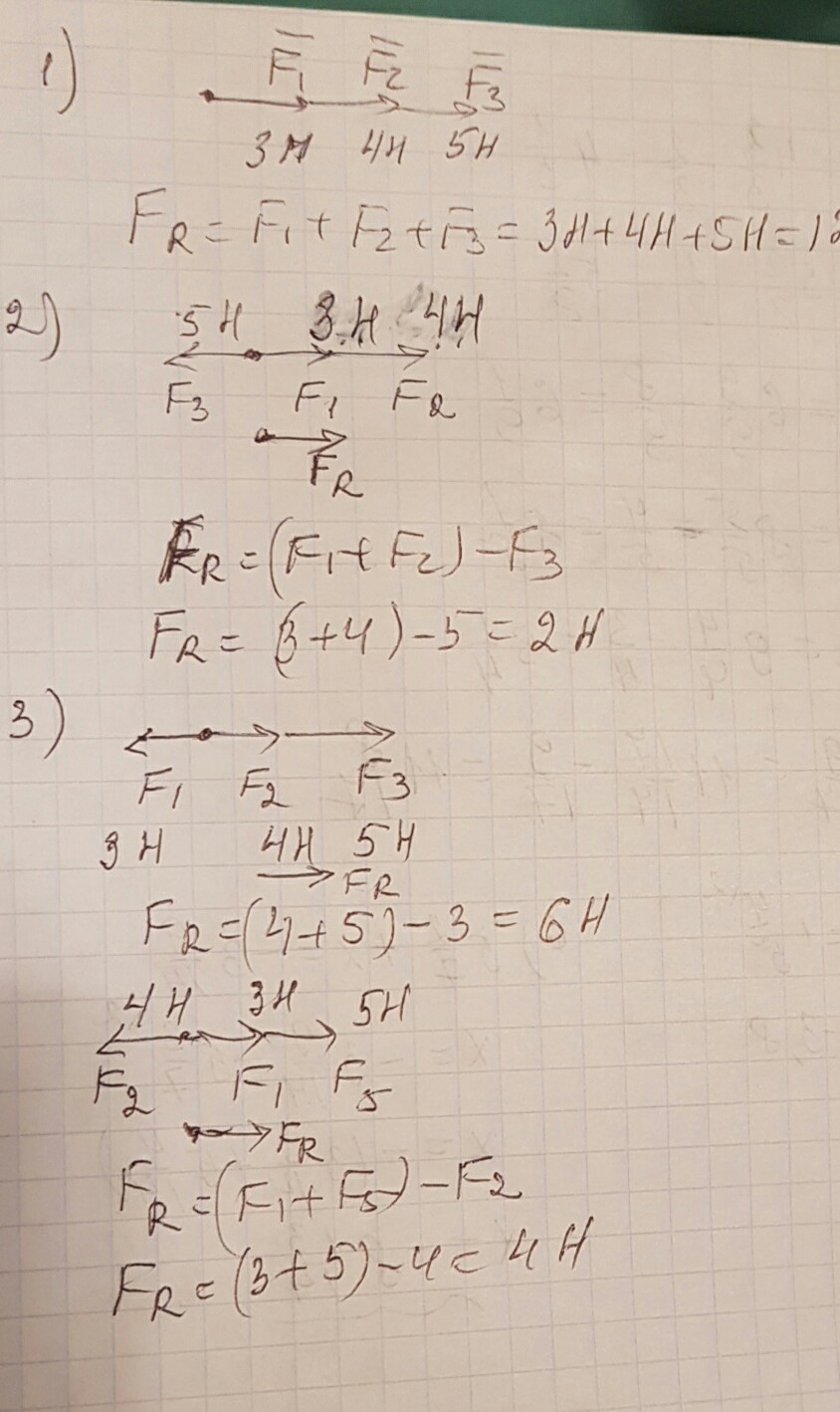 это и есть способы,силы направлены в разные стороны,или все а одну,по одной прямой.Я рассмотреть все варианты.Равнодействующая направлена в сторону большей силы.Жаль,что ты совсем не шаришьПопробуй разберись.Это совсем просто..