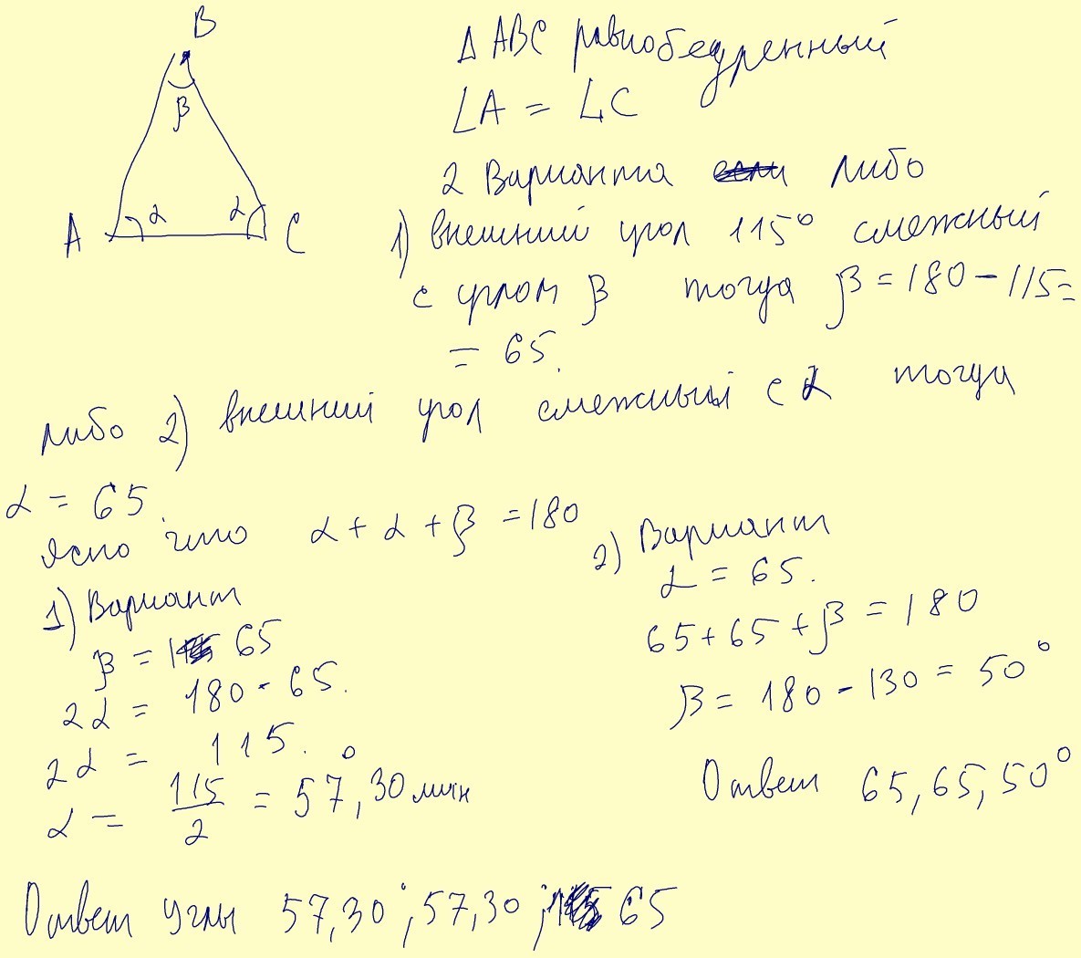 Один из внешних углов равнобедренного треугольника равен 115 градусов Найдите углы треугольника?????? помогитеее быстро