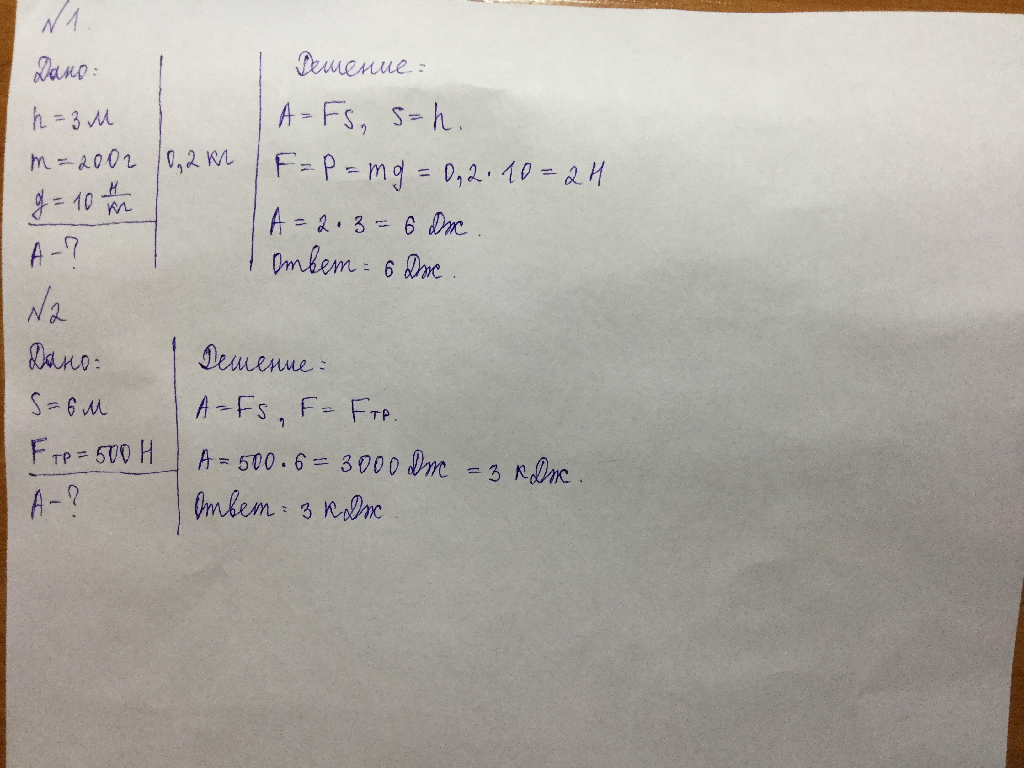 Помогите пожалуйста с задачами !!!! 1.Яблоко упало с дерево с высоты 3м. найдите работу силы тяжести,если известно , что масса яблока -200 г (здесь и ниже g=10/Hкг 2.Вычислите механическую работу, необходимую для прямолинейно равномерного перемещения тележки на расстояние 6 м , если сила трения при этом равна 500Н . ЗАРАНЕЕ СПАСИБО!!!!