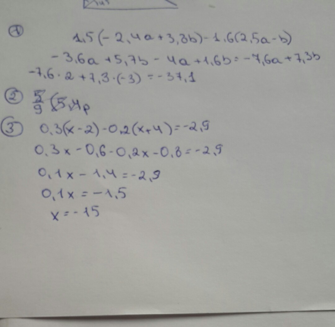1,5(-2,4a+3.8b)-1,6(2,5a-b). Якщо а= 2, b=-3