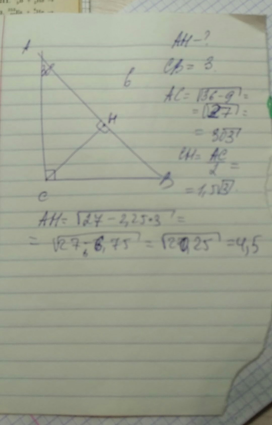 в треугольнике ABC (c=90 градусов ), CH высота , угол А =30 градусов , АВ=6 .Найдите AH