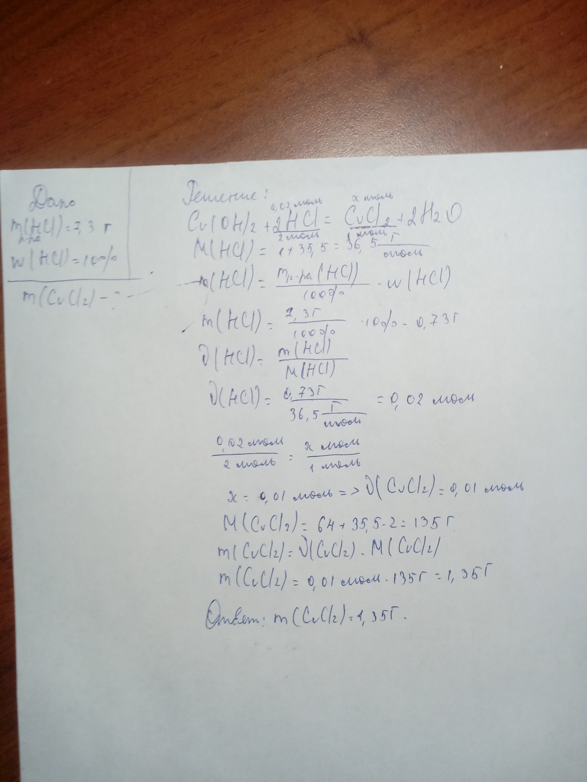 определите массу соли,которая образуется при взаимодействии гидроксида меди(2) с 7,3 г 10% раствора соляной кислоты