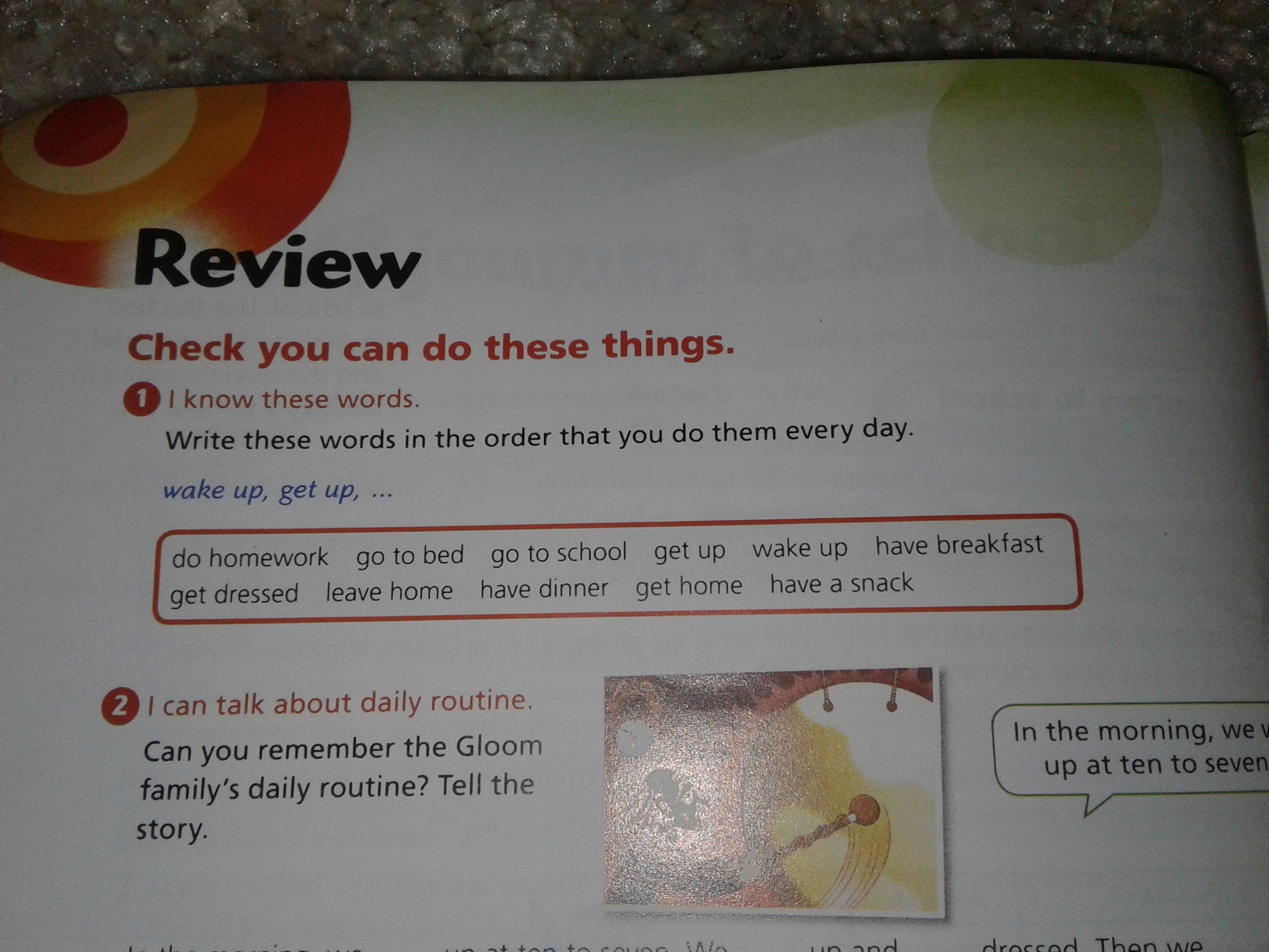 Wake up, get up, have breakfast, get dressed, leave home, go to school, have a snack, get home, do homework, go to bed