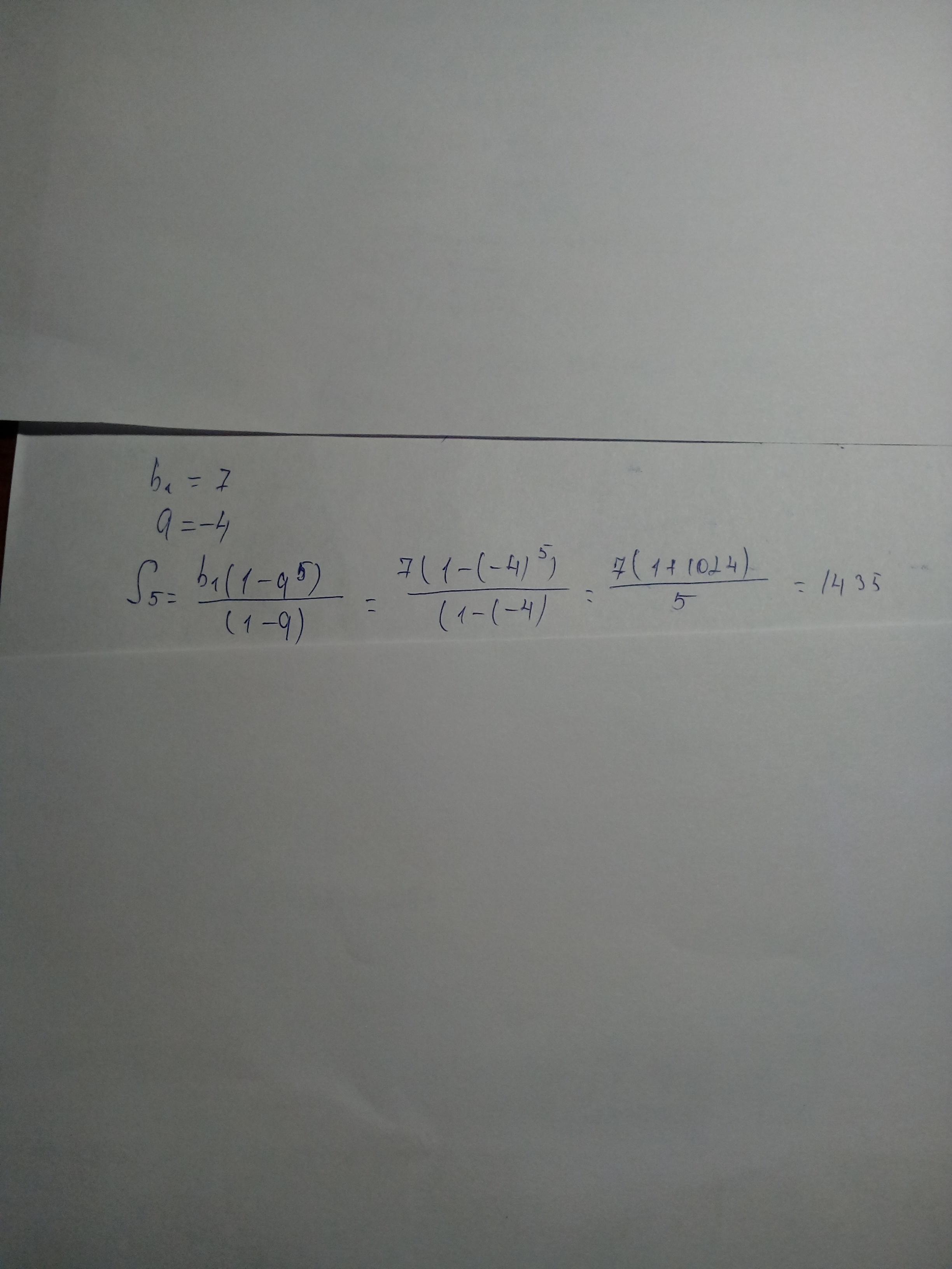 b2=b1*q=7*(-4)=-28. b3=b2*q=-28*(-4)=112. b4=b3*q=112*(-4)=-448. b5=b4*q=-448*4=1792. Сумма равна S=b1+b2+b3+b4+b5=7-28+112-448+1792=1435.