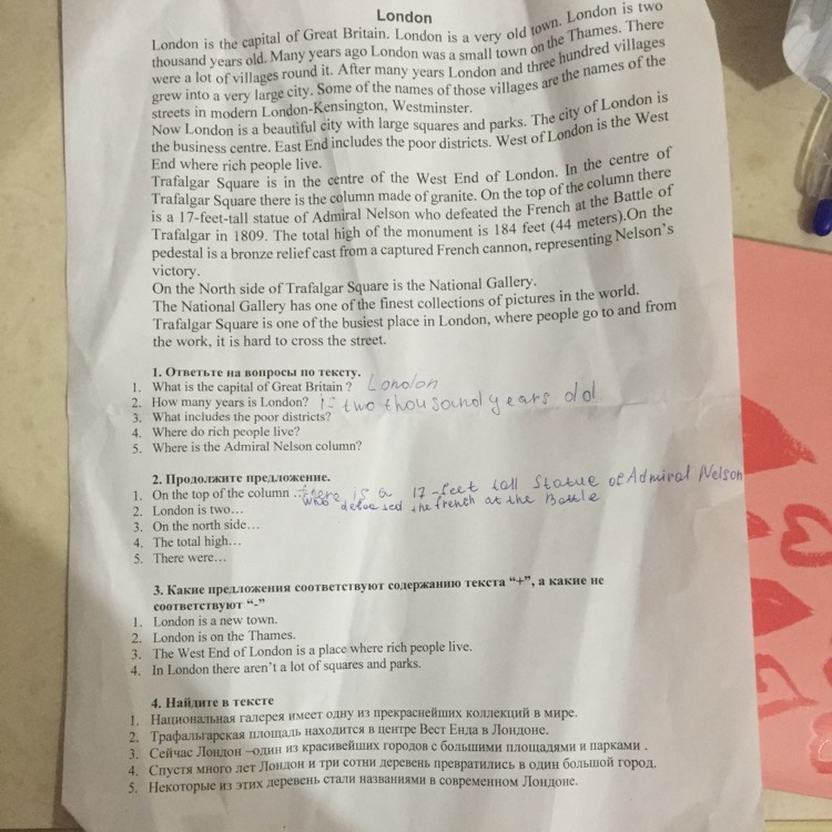 Лондон столица Великобритании. Лондон очень старый город. Ему около 2000 лет. Много лет назад Лондон был всего лишь маленьким городом на Темзе(река). Поблизости было много деревушек. После многих лет три тысячи деревушек и Лондон стали огромным городом. Некоторые названия улиц в нынешнем Лондоне взяты с названий тех, старых деревень Кенсингтон, Вестминстер.