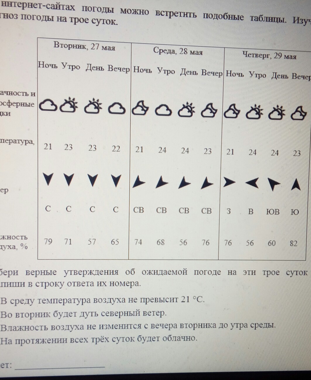 Правильные ответы: во вторник будет дуть северный ветер, на протяжении 3 суток будет облачно.