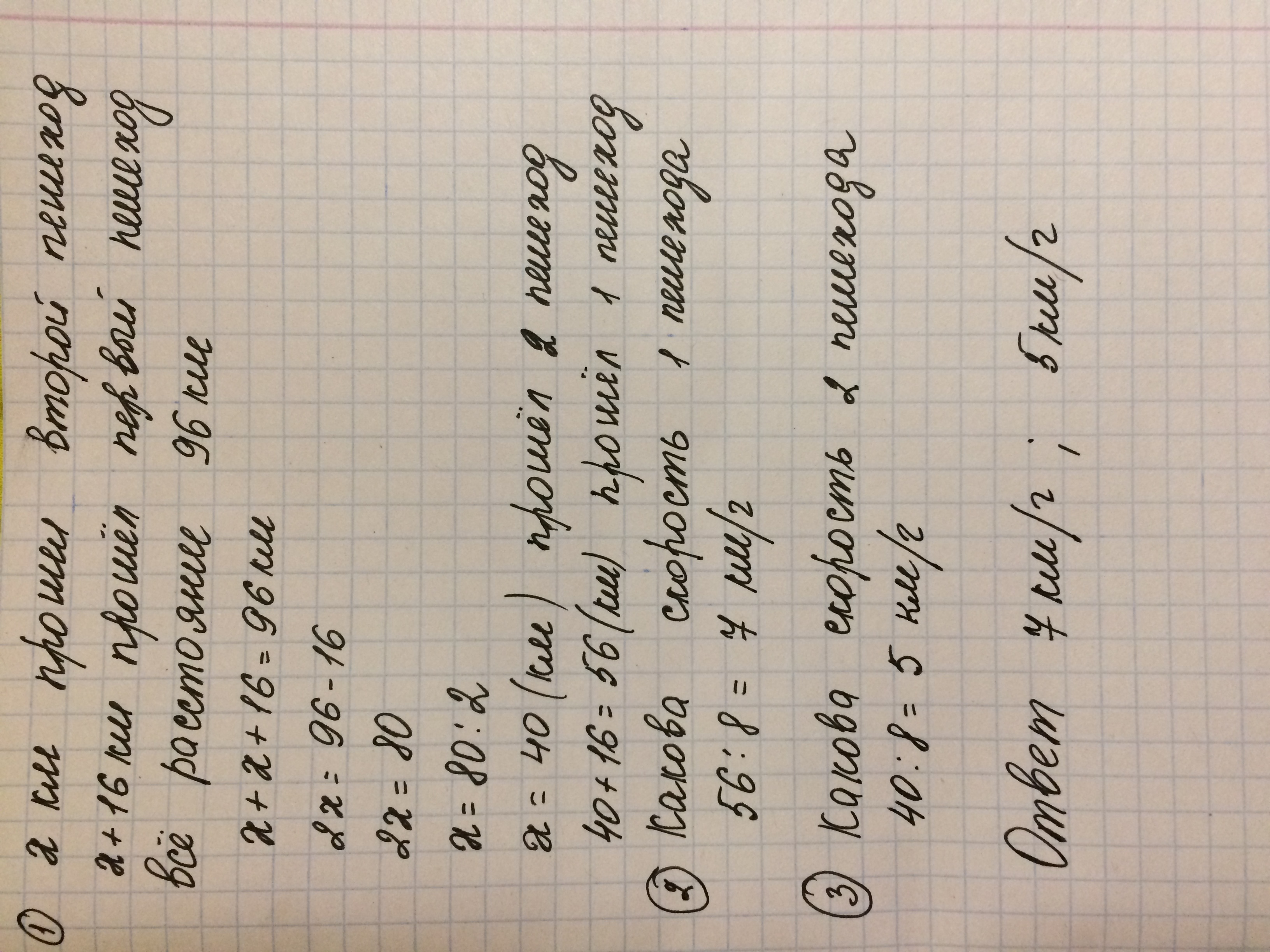сначала надо найти пройденый путь каждого. у одного 40. у второго 56 (х+х+16=86). теперь 40/8=5км/ч 56/8=7км/ч