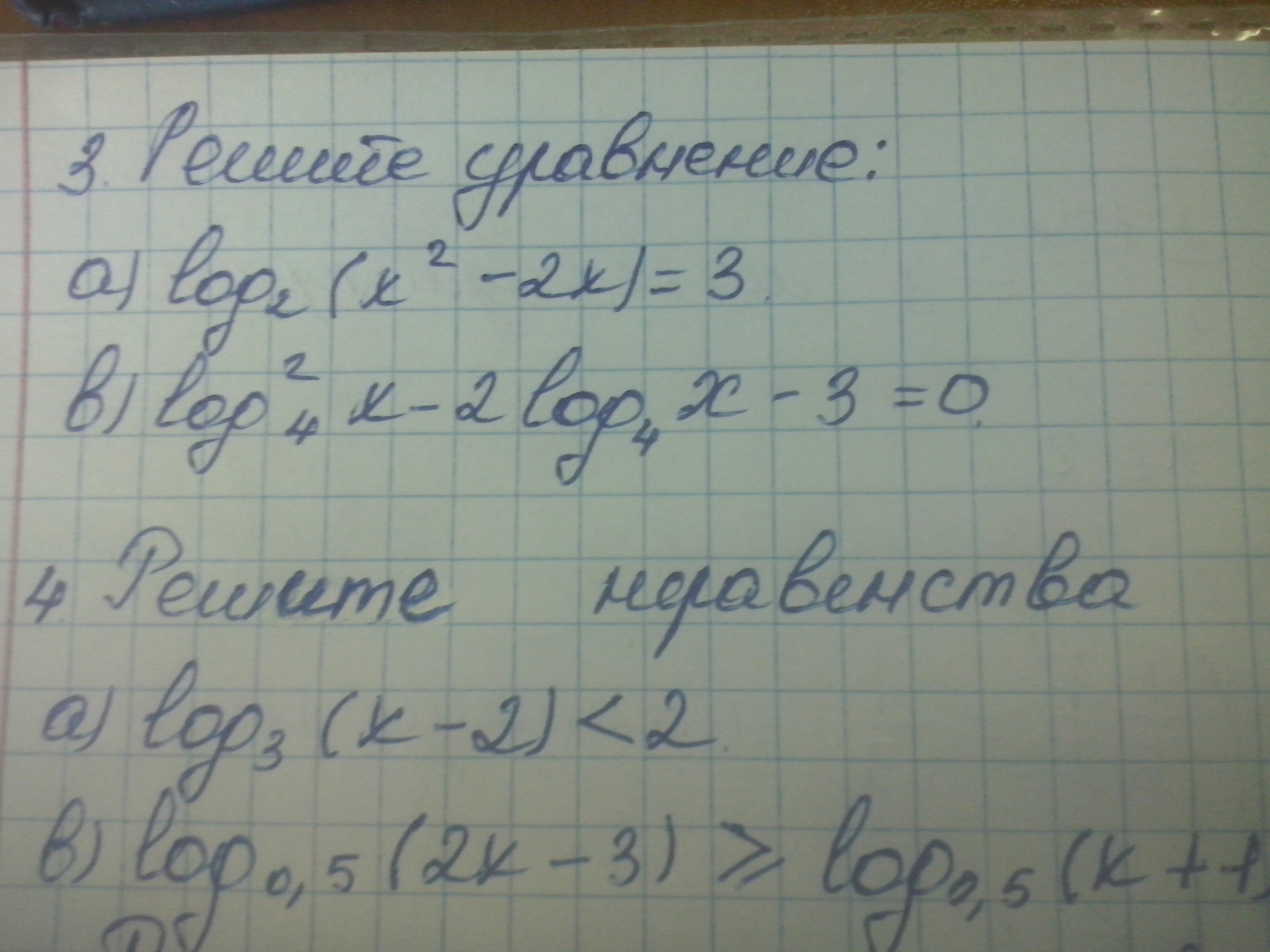 Log(2)(x^2-2x)-3; Log(2)(x^2-2x)=Log(2)8; x^2-2x=8; x^2-2x-8=0; D=(-2)^2-4*1*(-8)=36; x1=(2-6)/2; x2=(2+6)/2; x1=-2,x2=4.