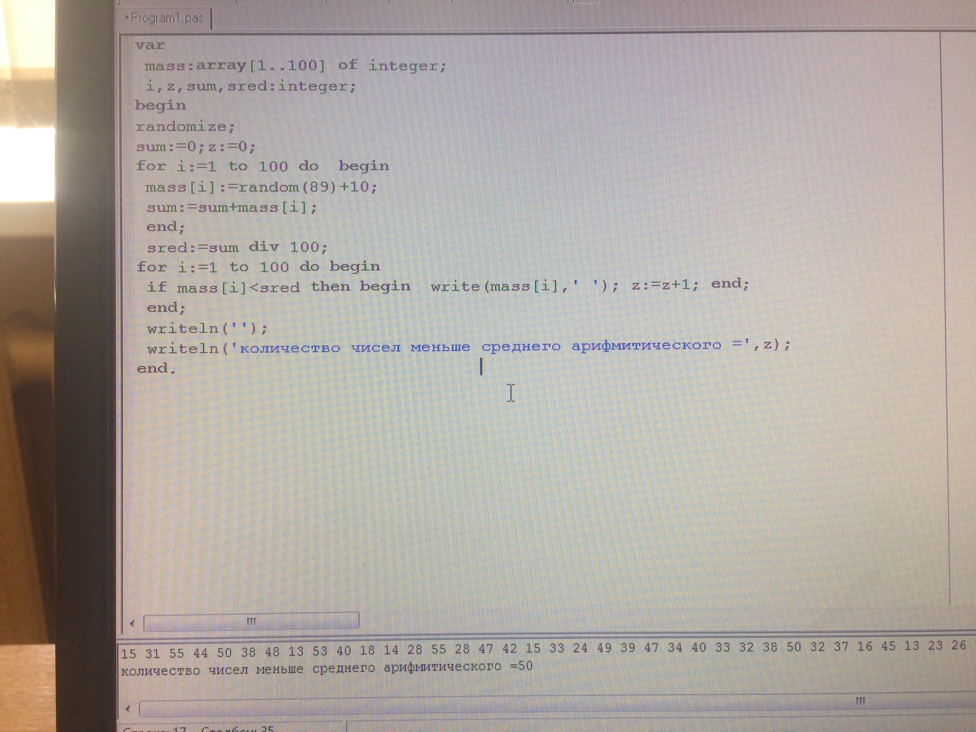 массив из 100 элементов заполнить двузначными числами определить в нём кол-во чисел меньше среднего арифметического всех значений