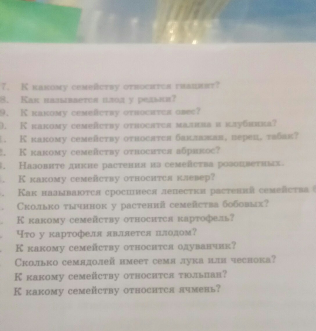 7) спаржевые 8корнеплод 9 злаковые 10 розоцветные 11 пасленовые 12 розоцветнве 13 таволга 14 бобовые 15лодочка 16 десять 17 пасленовые 18 ягода 19астровые 20 один 21 лилейные 22 злаковые