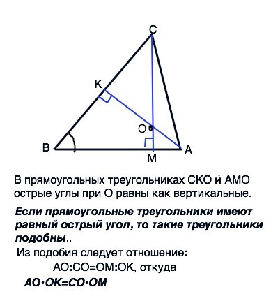 Высоты AK и CM остроугольного треугольника ABC пересекаются в точке O .Докажите , что AO*OK=CO*OM.