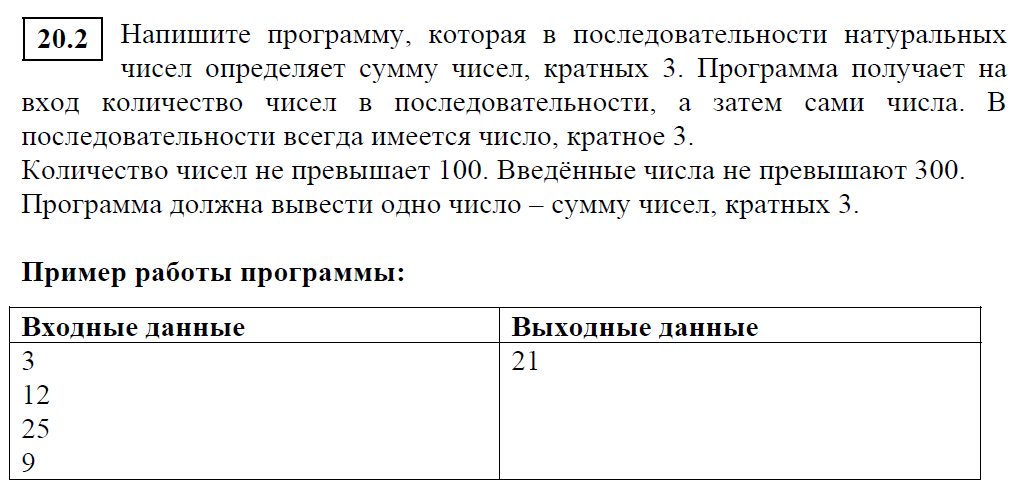 Напишите программу, которая в последовательности натуральных чисел определяет сумму чисел, кратных 3. Программа получает на вход количество чисел в последовательности, а затем сами числа. В последовательности всегда имеется число, кратное 3. Количество чисел не превышает 100. Введённые числа не превышают 300. Программа должна вывести одно число – сумму чисел, кратных 3.