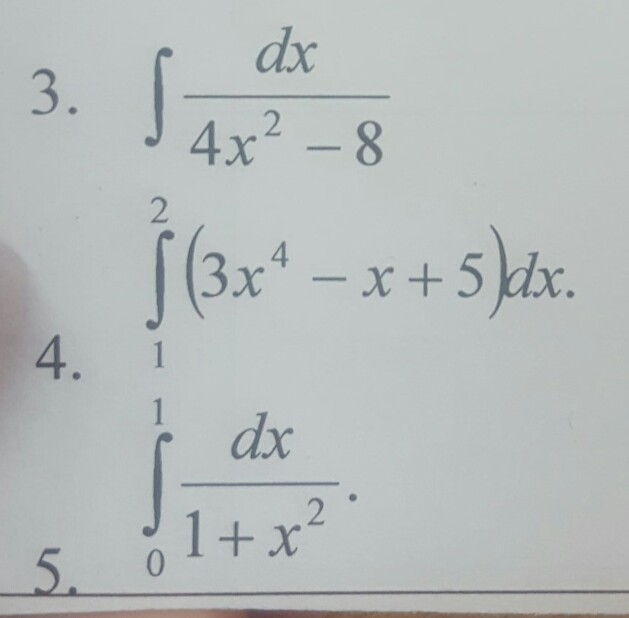displaystyle 3.,, intlimits { frac{dx}{4x^2-8} } , = frac{1}{4} intlimits { frac{dx}{x^2-2} } , =- frac{1}{8 sqrt{2} } ln bigg| frac{ x-sqrt{2} }{x+ sqrt{2} } bigg|+C