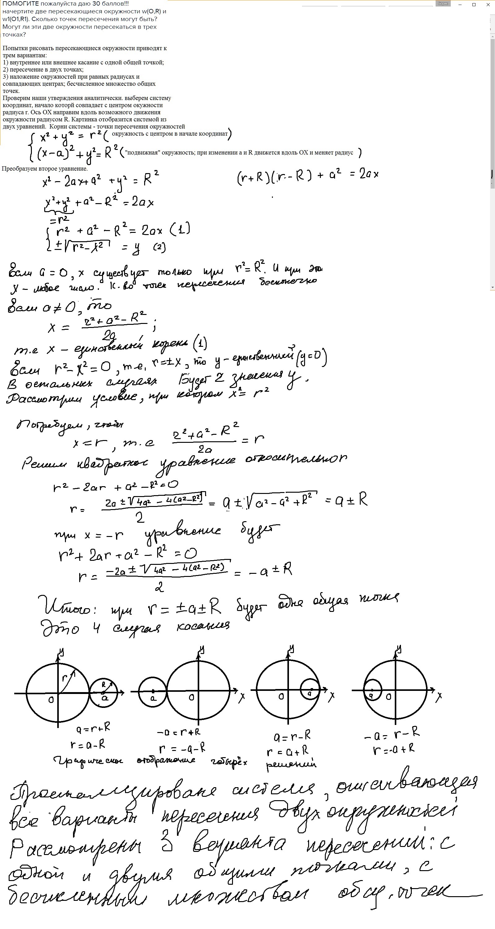 начертите две пересекающиеся окружности w(O,R) и w1(O1,R1). Сколько точек пересечения могут быть? Могут ли эти две окружности пересекаться в трех точках?