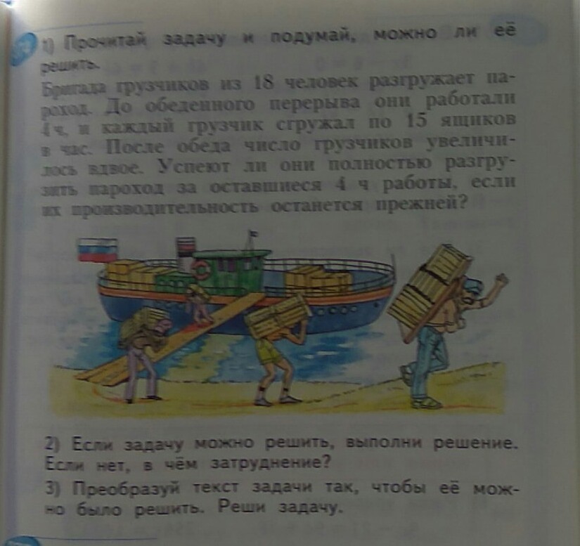 I вариант. На пароходе 3240 ящиков. Бригада грузчиков из 18 человек разгружает пароход.До обеденного перерыва они работали 4 часа, и каждый грузчик сгружал по 15 ящиков в час. После обеда число грузчиков увеличчилось вдвое. Успеют ли они полностью разгрузить пароход за оставшиеся 4 часа работы,если их производительность останется прежней?