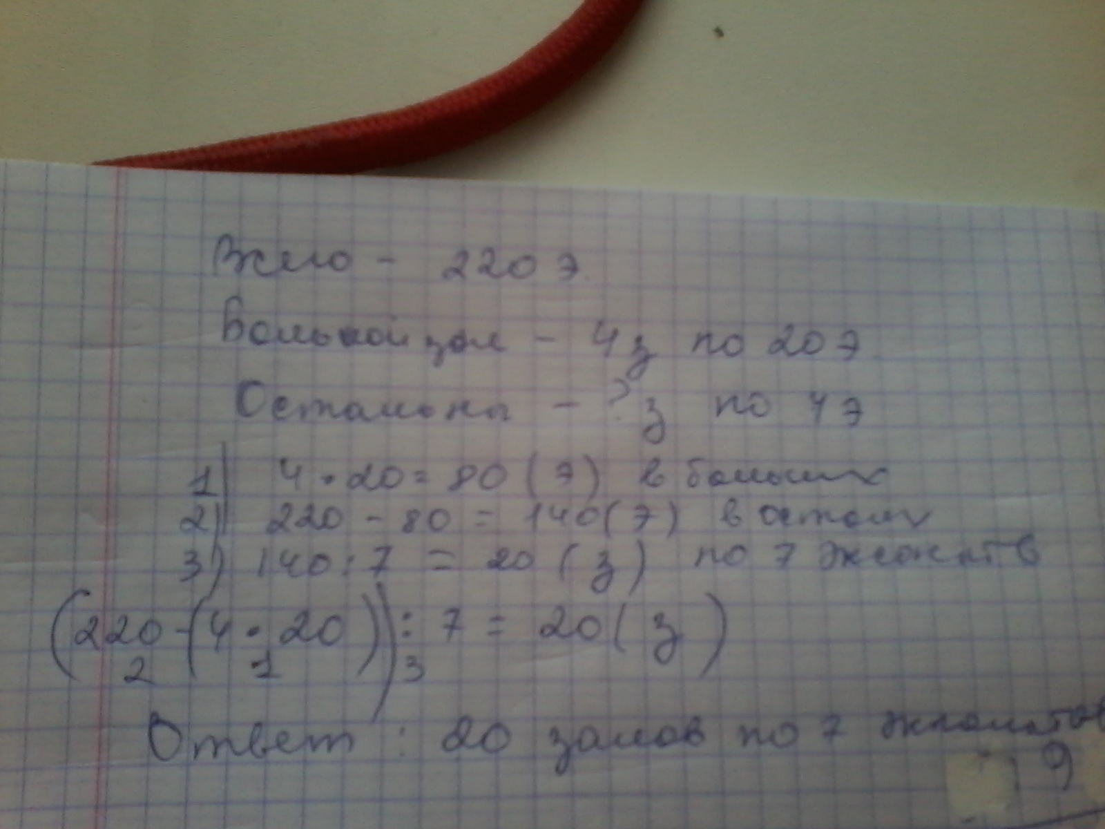 В городском музее 220 экспонатов. В 4 больших залах по 20 экспонат, в остальных залах по 7 экспонатом . Сколько залов с 7 экспонатами в музее?