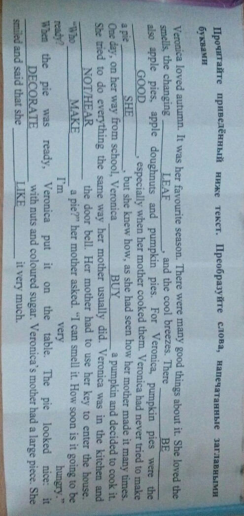 Веронике нравилась осень. Это был её любимый сезон года. В это время происходило много интересных вещей . Она любила запах осени, осенний листопад и прохладную (ое) свежесть( дыхание) осени . A так же яблочные пироги, яблочные пончики и тыквенный пироги. Самым любимым лакомством Вероники был тыквенные пироги, особенно те, которые готовила ее мама . Вероника никогда не пыталась приготовить пирог сама, но она знала , как это делается, поскольку наблюдала много раз, как готовит его мама . Однажды, по дороге из школы, Вероника купила тыкву и решила приготовить ее. Она тыкалась все сделать так же , как обычно делала Ее мама. Вероника была на кухне и не слышала звонка в дверь . Мама открыла своим ключом дверь и вошла в дом. Кто печёт пирог? - спросила Ее мама.я слышу его запах! Через сколько он будет готов ? Я очень голодна. Когда пирог был готов , Вероника поставила его на стол. Пирог был великолепен : он был украшен орехами, цветным сахаром . Мама Вероники взяла себе большой кусок. Она улыбнулась и сказала , что ей он очень понравился .