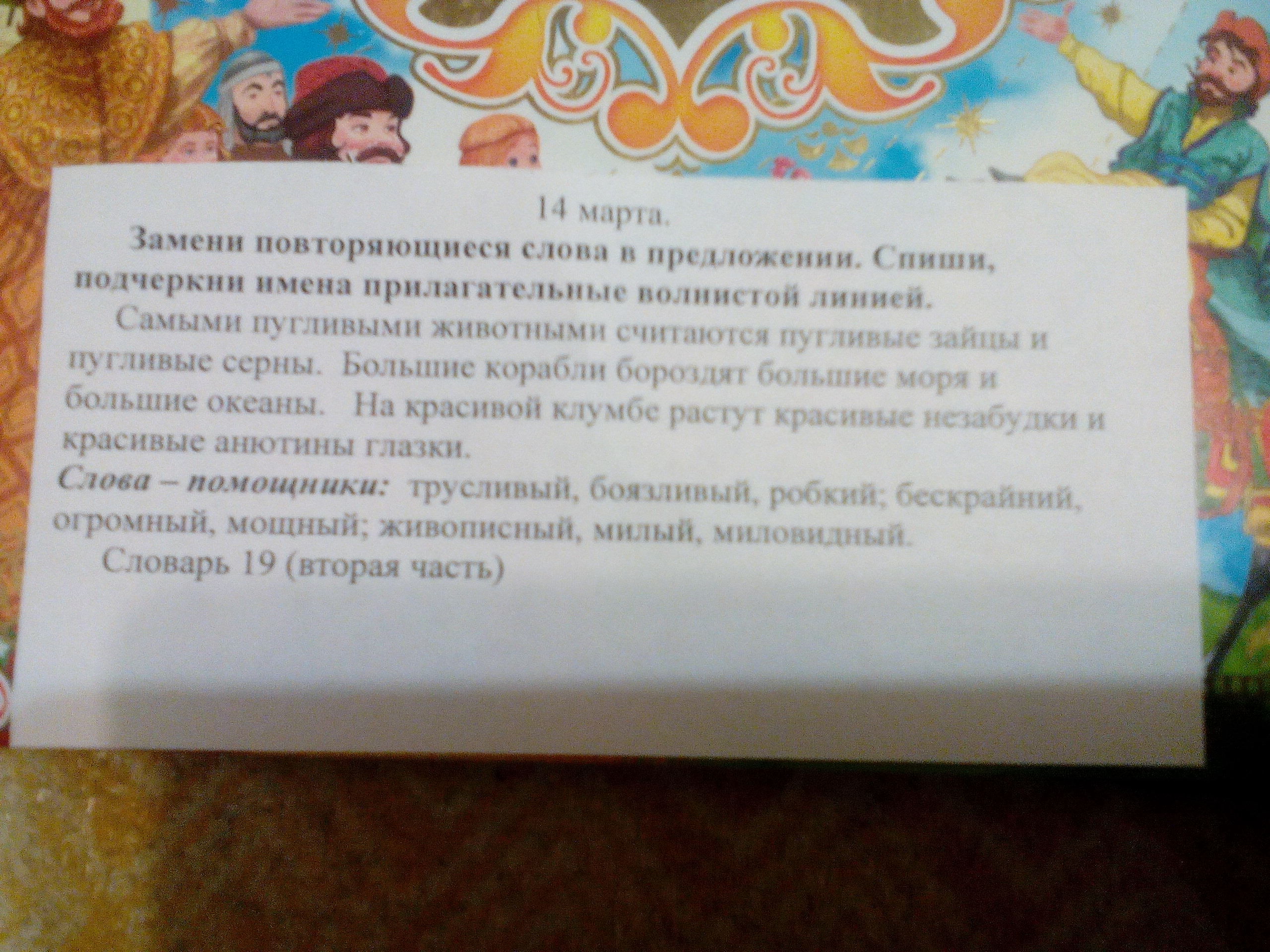 1) Самыми боязливыми животными считаются трусливые зайцы и робкие серны. Мощные корабли бороздят огромные моря и бескрайние океаны. На живописной клумбе растут милые незабудки и миловидные анютины глазки.