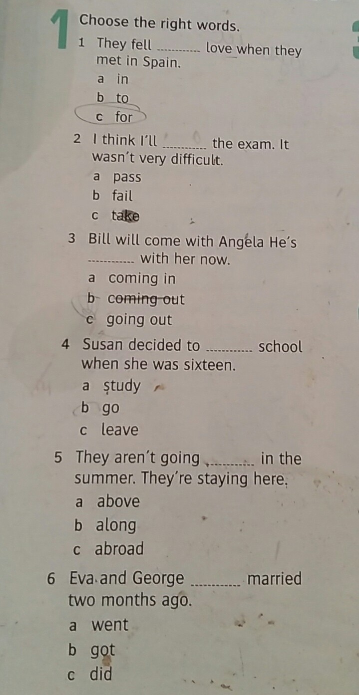 1. for 2. take 3. going out 4. leave 5.along 6. did