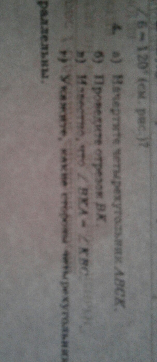 а) Начертите четырехугольник ABCK. б) Проведите отрезок BK. в) Известно что угол BKA=углу KBC. г) Укажите какие стороны треуголиника параллельны.