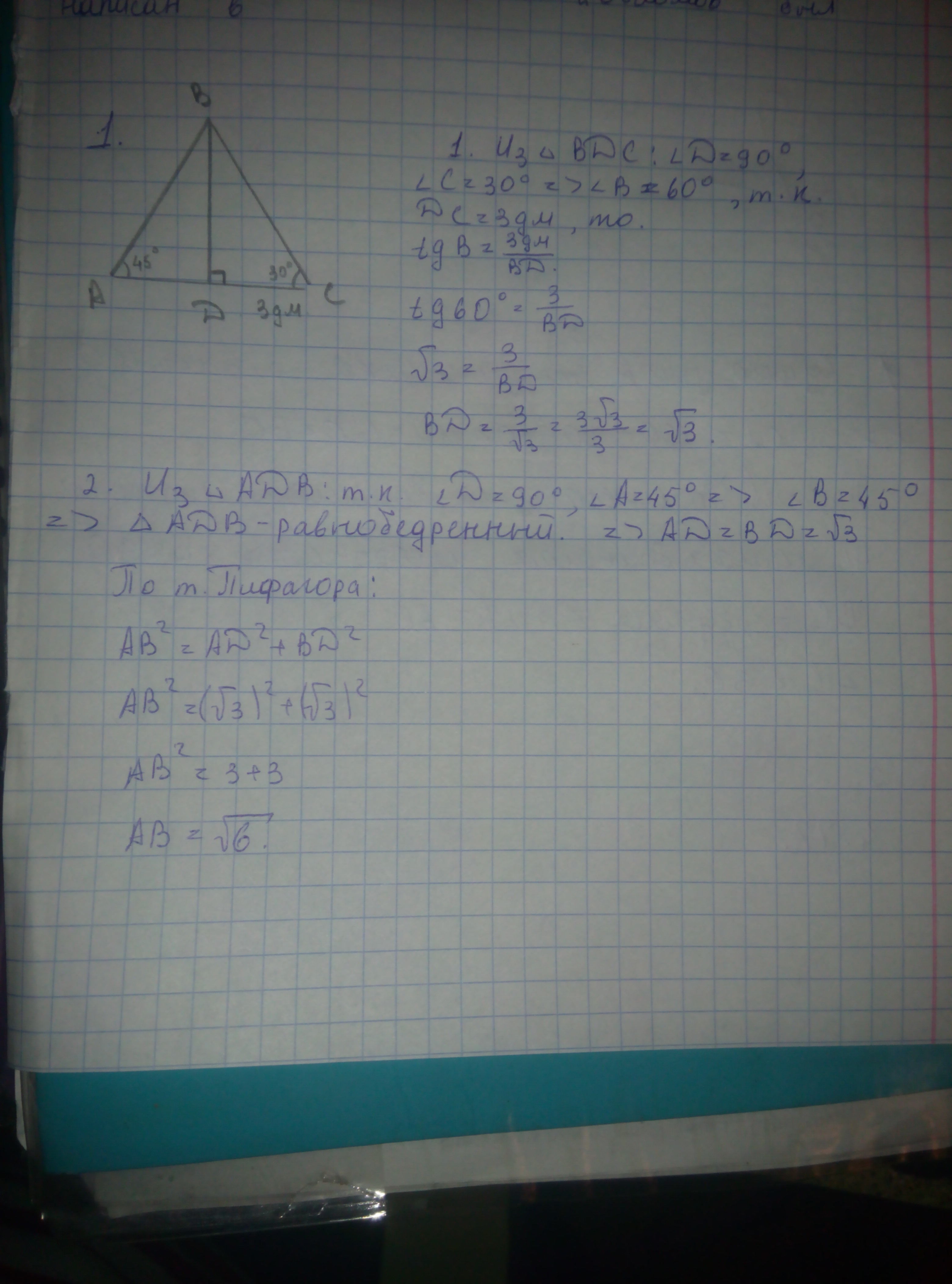 1) В треугольнике АВС проведена высота ВD. Известно, что угол А равен 45 градусов, угол С равен 30 градусов, а отрезок DС 3 дм. Найдите АВ.