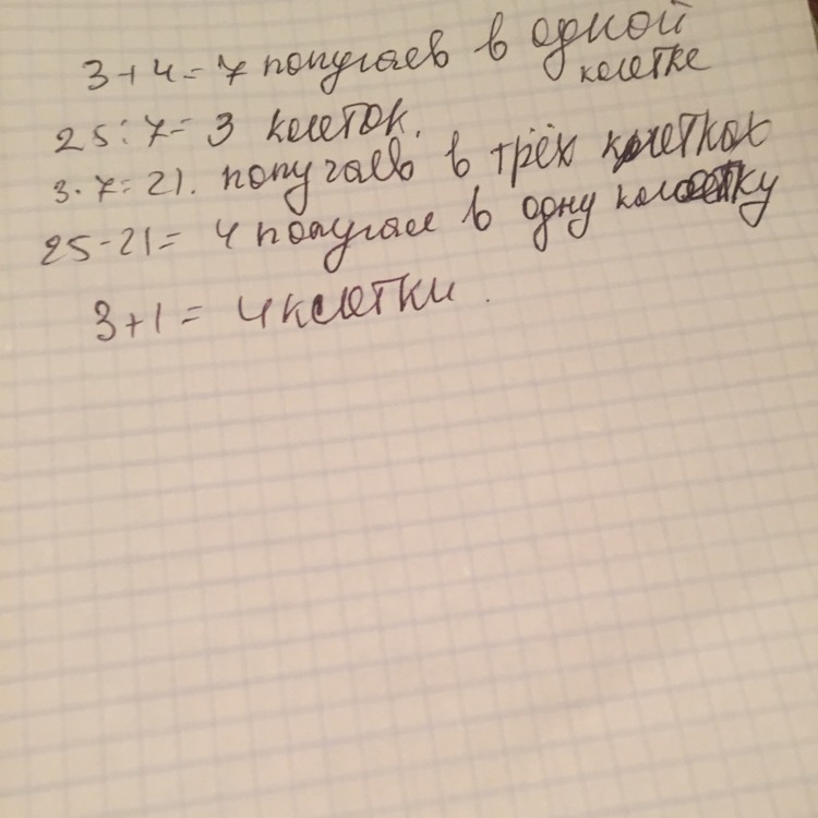 В зоомагазинах в клетках сидят 25 волниствх попугаев. В каждой клетке 3 зеленых и 4 желтых попугаев. Сколько клеток с попугаеми?