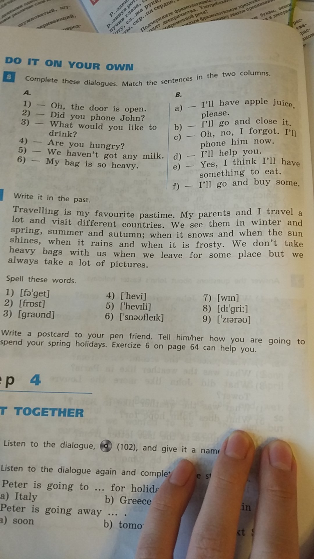 Travelling was my favourite pastime. My parents and I travelled a lot and visited different countries. We saw them in winter and spring, summer and autumn. when it snowed and when the sun shined, when it rained and when it was frosty. We didn't take heavy bags with us when we left for some place but we always took a lot of pictures.
