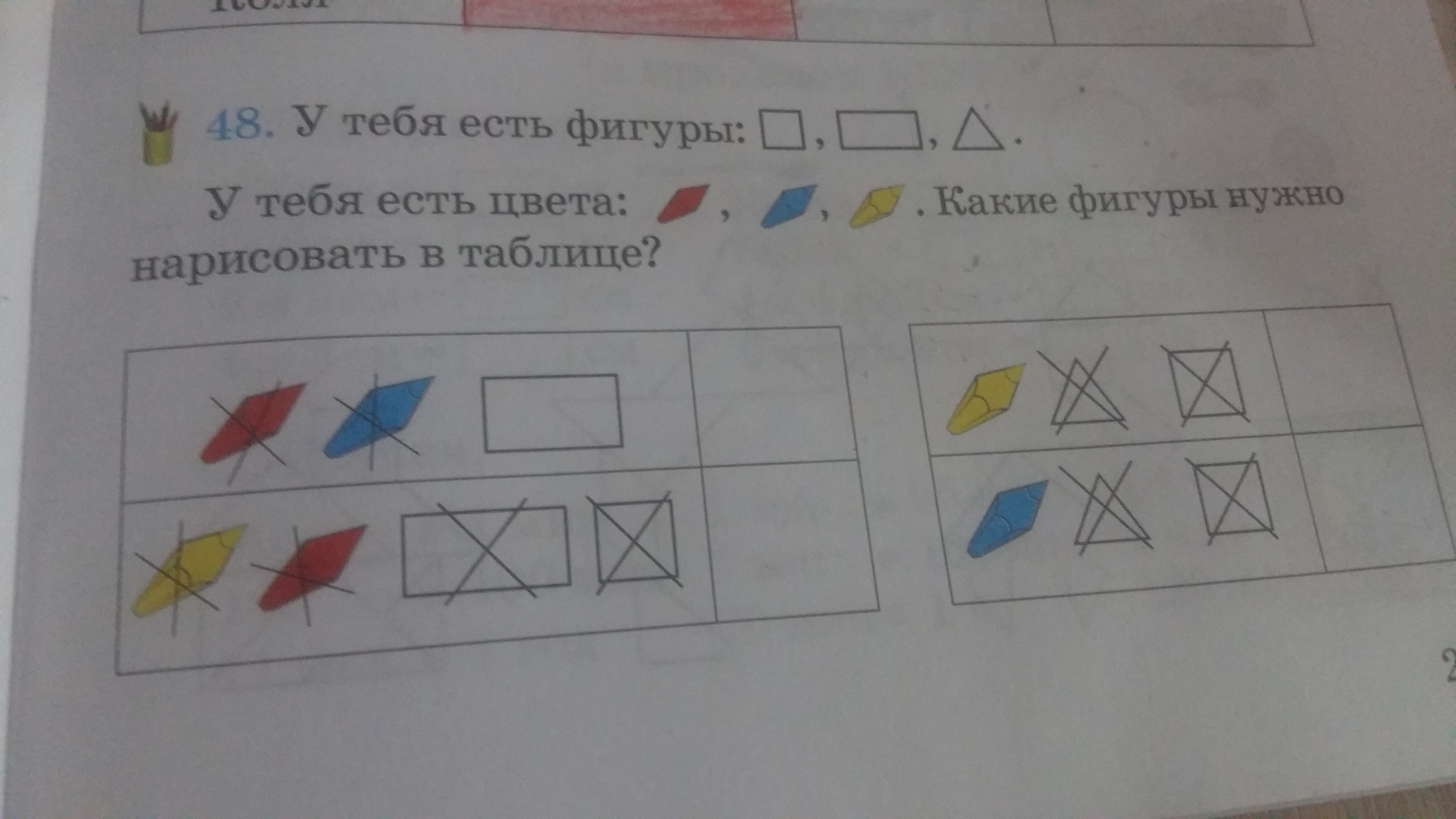если цвет зачёркнут, значит, им закрашивать не надо, а если фигура зачёркнута, то надо нарисовать другую