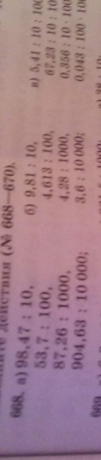 98,47:10=9,847 53,7:100=0,537 87,26:1000=0,08726 904,63:10000=0,090463 9,81:10=0,981 4,613:100=0,04613 4,28:1000=0,00428 3,6:10000=0,00036