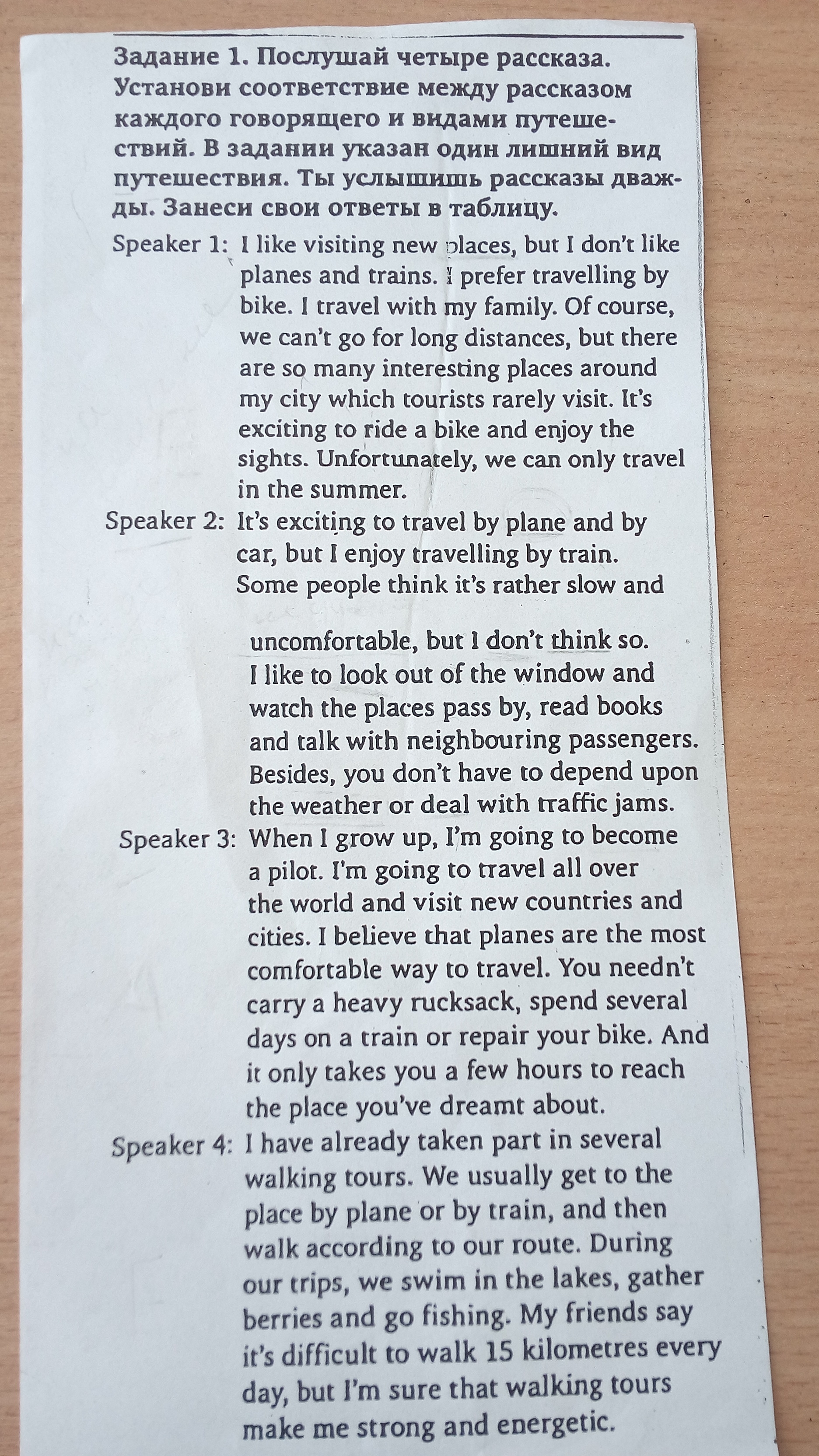1 я люблю посещать новые места, но я не люблю самолеты и поезда. я предпочитаю путешествовать на велосипеде. я путешествую со своей семьей. конечно, мы не может идти на новые дистанции, но там есть так много интересных мест по городу которые туристы редко посещают. это волнительно ехать на велосипеде и наслаждаться видами. к сожалению, мы можем путешествовать только летом. 2 это волнительно путешествовать на самолете или на машине, но я наслаждаюсь путешествием на поезде. некоторые люди думают что это довольно медленно и некомфортно, но я не думаю так. я люблю смотреть в окно и смотреть на места, которые проезжаем, читать книги и разговаривать с соседями пассажирами. по крайней мере, вы не должны зависеть от погоды или справляться с пробками 3 когда я вырасту я собираюсь стать пилотом. я собираюсь путешествовать по миру и посещать новые страны и города. я думаю что самолеты это самый комфортный путь чтоб путешествовать. вам не нужно нести тяжелый рюкзак, проводить несколько дней в поезде или ремонтировать велосипед. это занимает несколько часов чтоб достигнуть место о котором вы мечтаете. 4) я уже приняла учатие в несколько пешеходных турах. мы обычно добираемся до места самолетом или поездом, и затем гулять согласно маршруту. в течении наших поездок, мы плаваем в озерах, собираем ягоды и рыбачим. мои друзья говорят что это трудно гулять 15 км каждый день но я уверена что пешеходные туры делают меня сильной и энергичной.