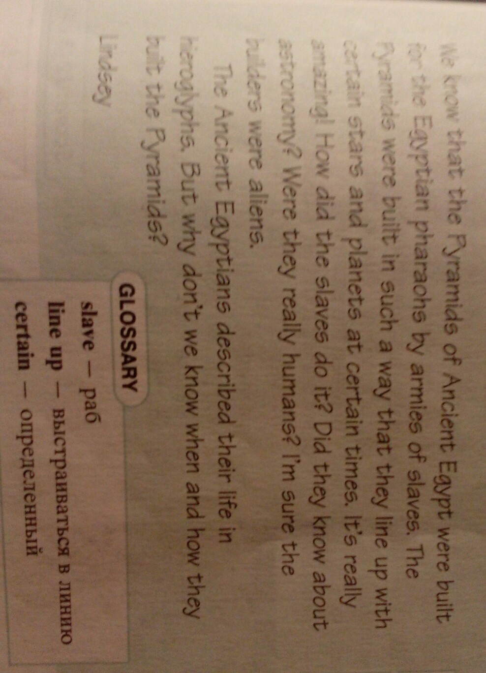 Мы знаем, что пирамиды древнего Египта были построены для египетских фараоном армиями рабов. Пирамиды были построены таким образом, что они выстраиваются в линию с определенными звездами и планетами в определенное время. Это действительно удивительно! Как рабы это сделали? Они знали об астрономии? Они и вправду были людьми? Я уверена, что строители были инопланетянами.