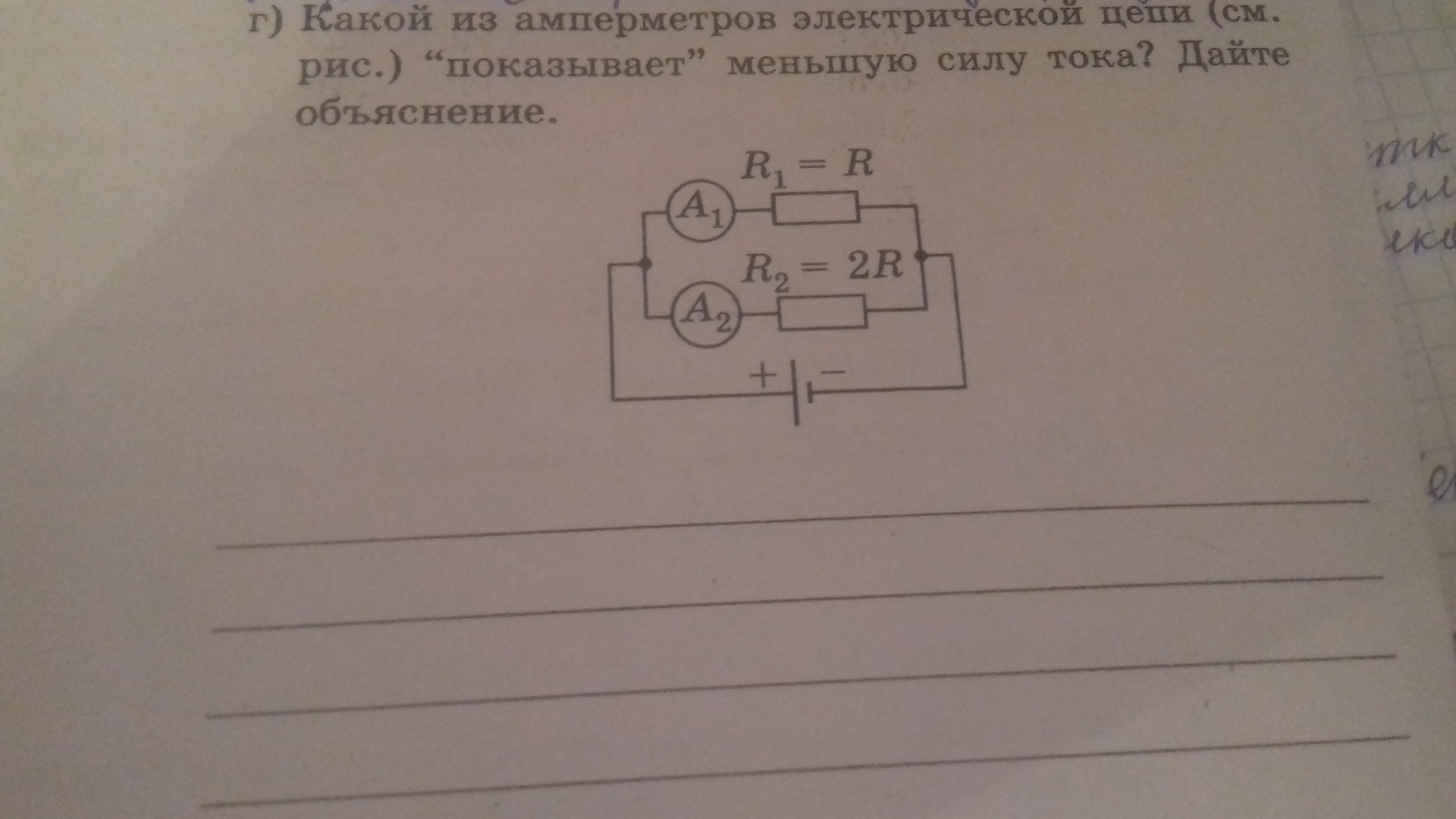 какой из ампер метров электричество цепи "показывает" меньшую силу тока? Дайте объяснение.