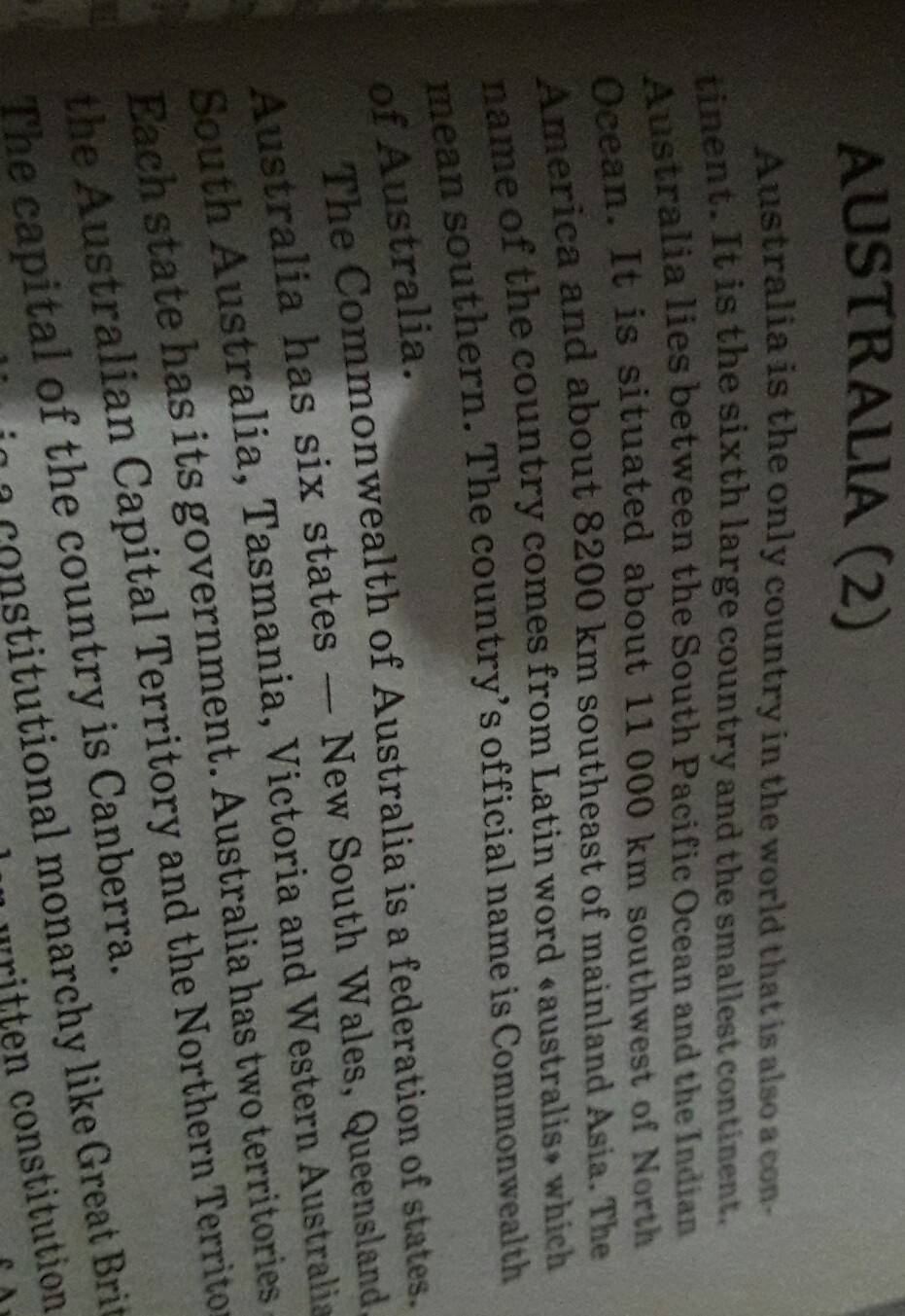 Australia, or the Commonwealth of Australia, as it is officially called, is situated on the island continent. It also occupies the Island of Tasmania and some minor islands round the coast of the continent.