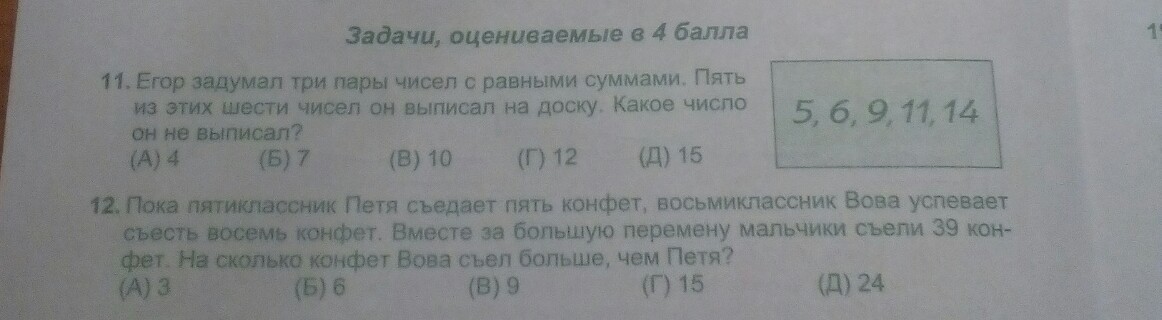 Игорь задумал три пары чисел с равными суммами пять из этих шести чисел он выписал на доску какое число он не выписал