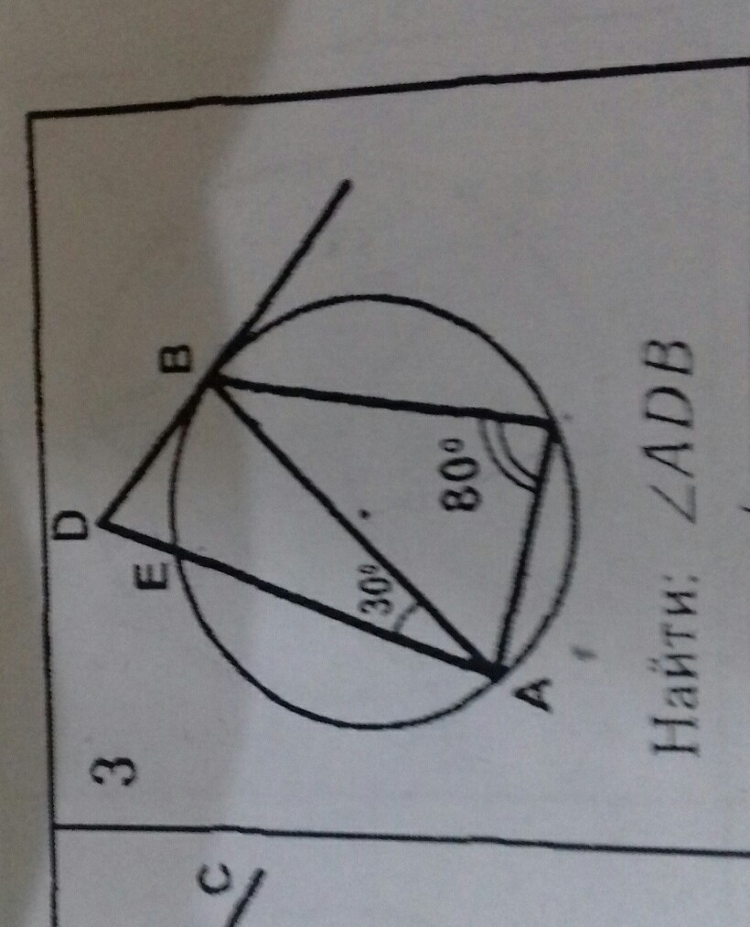 ∠DBA=∠BCA=80° (C - это как раз вершина вписанного угла, по условию равного 80°), так как оба равны половине дуги AEB⇒