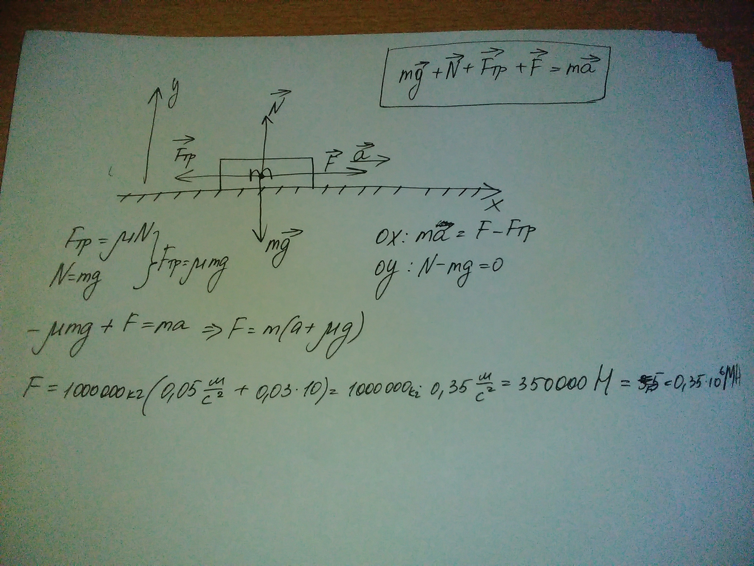 Поезд массой 1000 т движется с ускорением 0,05 м/c в квадрате. Найдите силу тяги, если коэффициент сопротивления равен 0,03