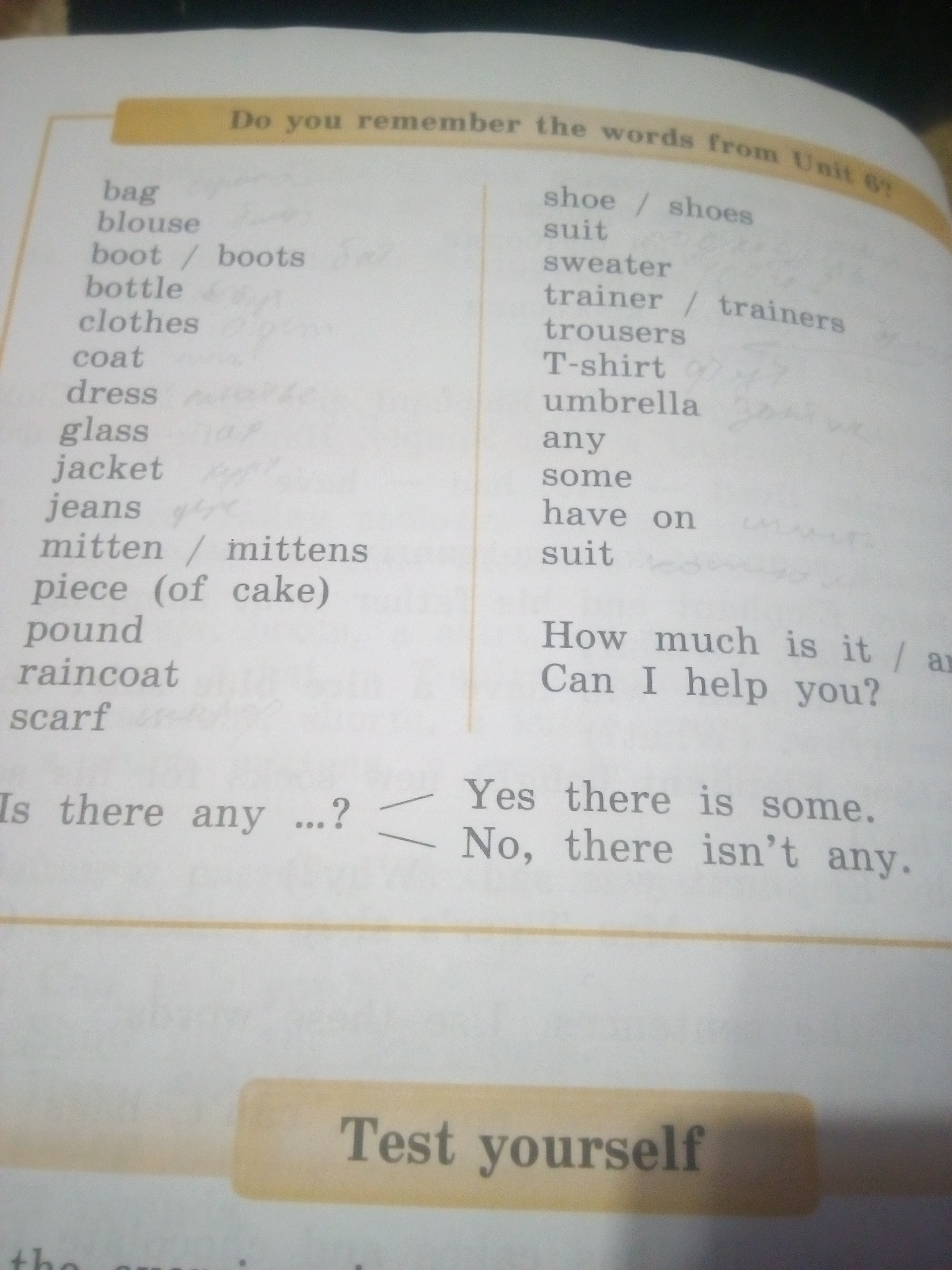1.мешок,2.блузка,3.бутылка,4.одежда,5.пальто,6.шутник,7.куртка,8.джинсы,9.руковицы,10.кусок,11.фунт,12.шарф,13.glass-стакан/стекло.