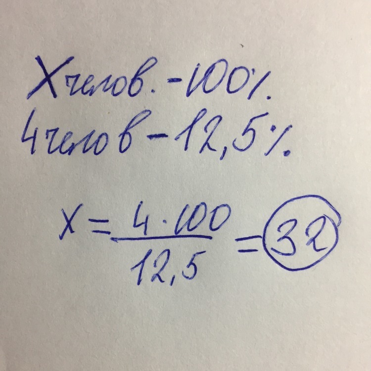В классе отсутствовали 4 человека, что составило 12,5% всех учащихся этого класса. Сколько учащихся в классе?