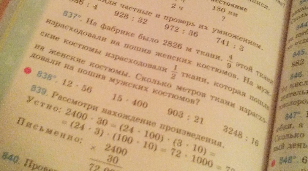 1) 2826 * 4 : 9 = 1256 (м) - ткани на женские костюмы.