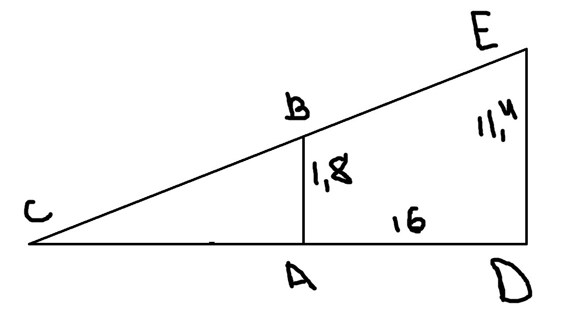человек ростом 1.8 м стоит на расстоянии 16 м от столба, на котором висит фонарь на высоте 11,4 м. Найдите длину тени человека в метрах.