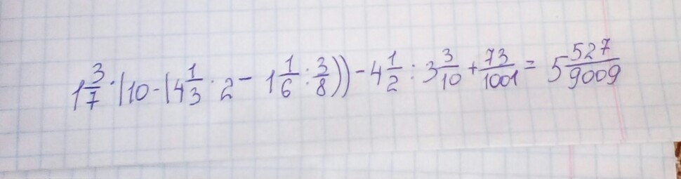 вычислите: 1 целая 3/7*(10 целых-(4 целых 1/3*2 целых-1 целая 1/6:3/8)-4 целых 1/2:3 целых 3/10+73/1001