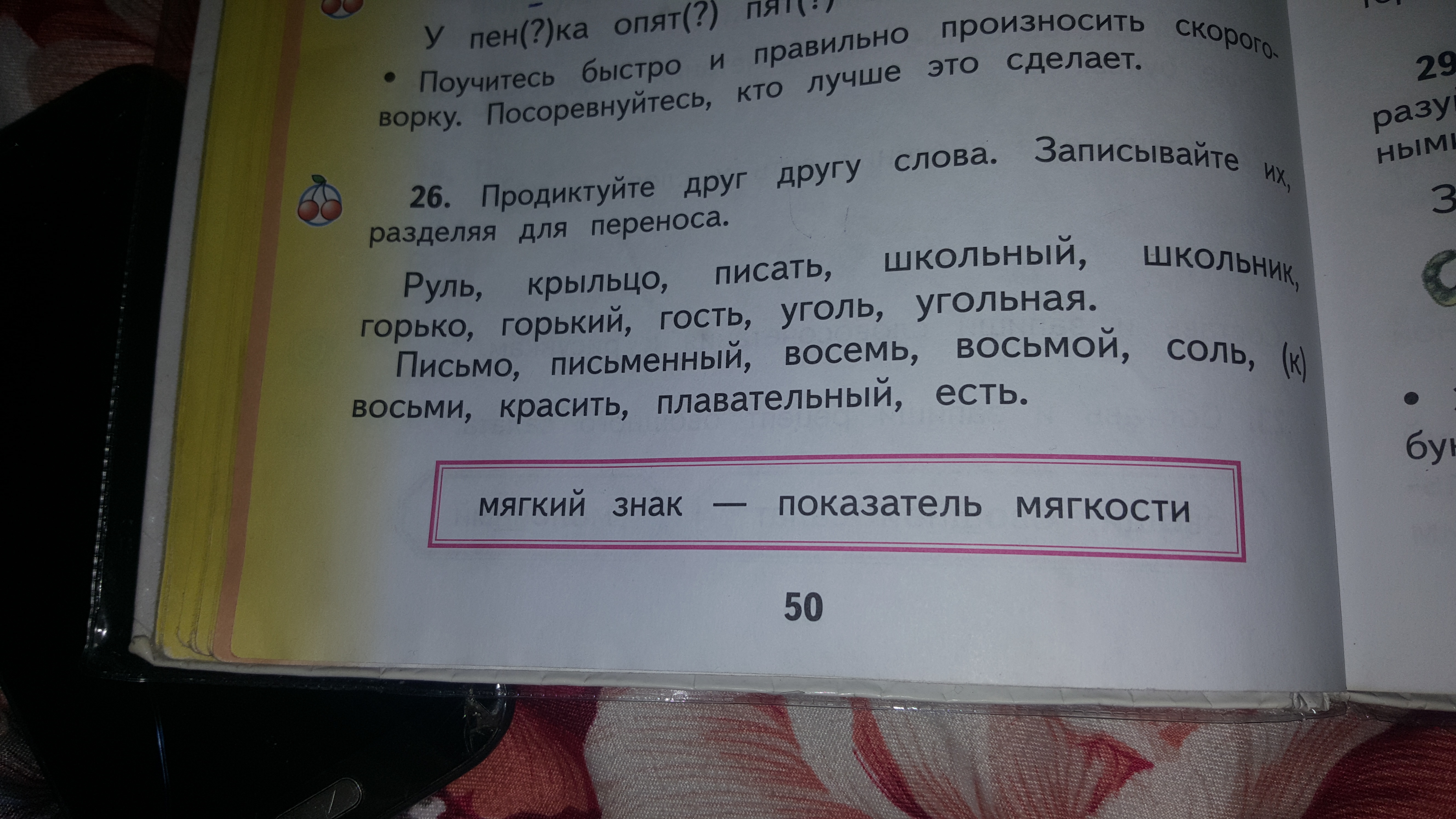 продиктуйте друг другу слова. записывайте их, разделяя для переноса. руль, крыльцо, писать, школьный, школьник, горько, горький, гость, уголь, угольная. письмо, письменный, восемь, восьмой, соль, (к) восьми, красить, плавательный, есть.