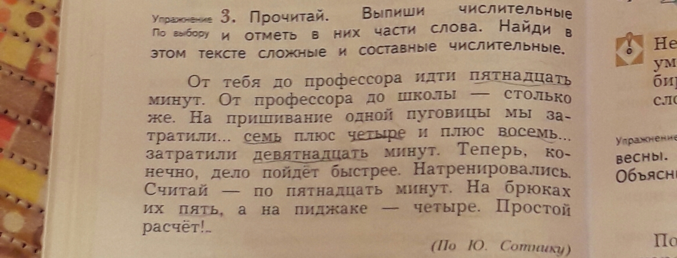 Прочитай. Выпиши числительные и отметь в них части слова. Найди в этом тексте и состов