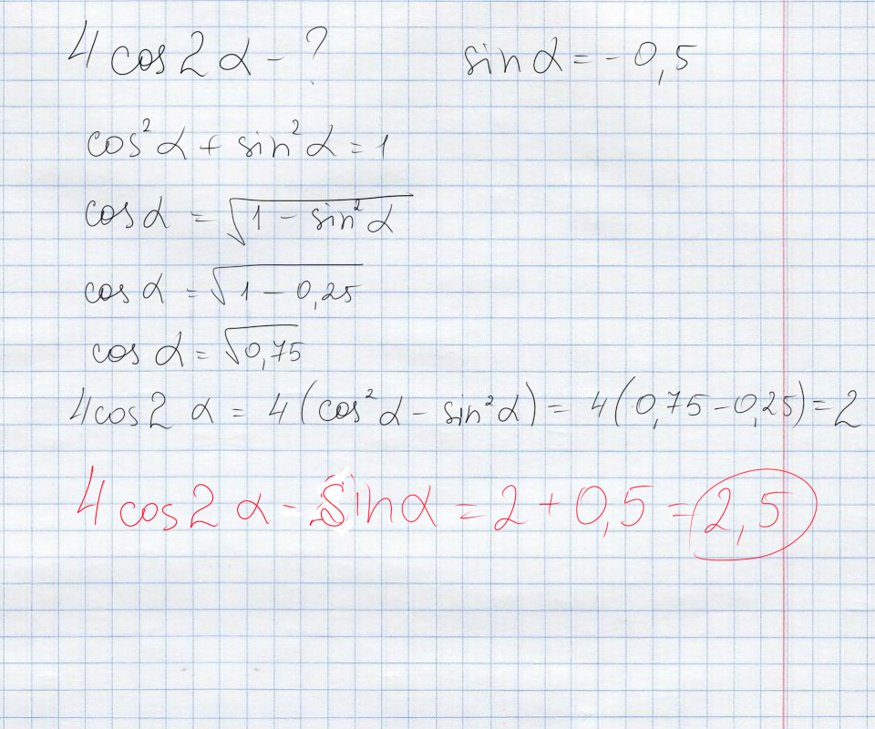 4cos2a-sina= 4(1-2(Sina)^{2))-sina=4-8*1/4+1/2=2+1/2=2,5