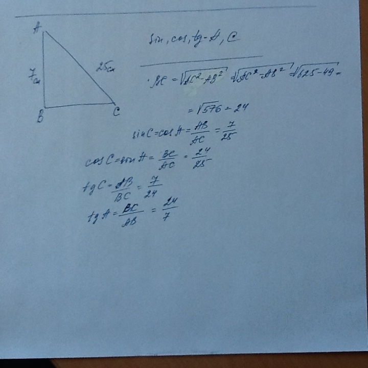 Найдите синус косинус и тангенс острых углов А и С прямоугольного треугольник АВС если АС-25 см, АВ-7 см