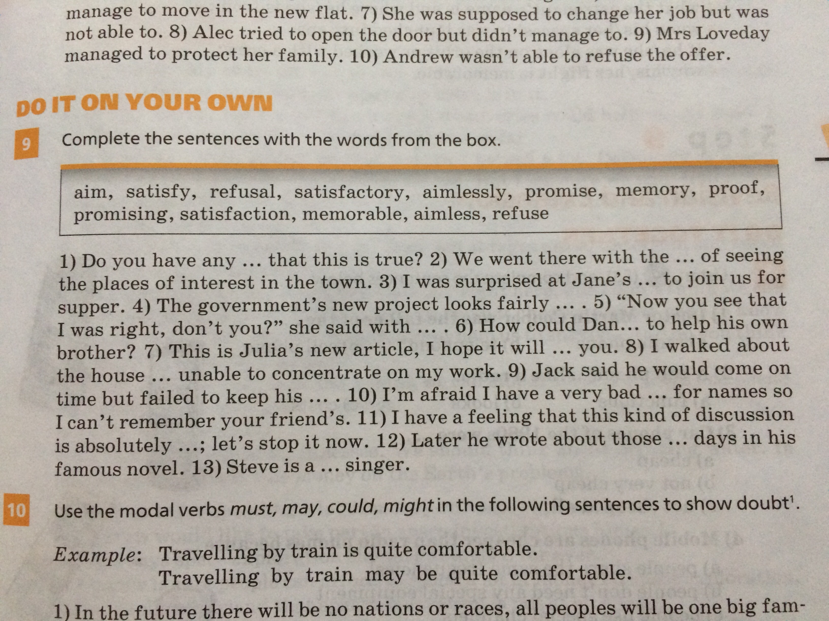 1) proof 2) aim 3) refusal 4) satisfactory 5) satisfaction 6) refuse 7) satisfy 8) aimlessly 9) promise 10) memory 11) aimless 12) memorable 13) promising